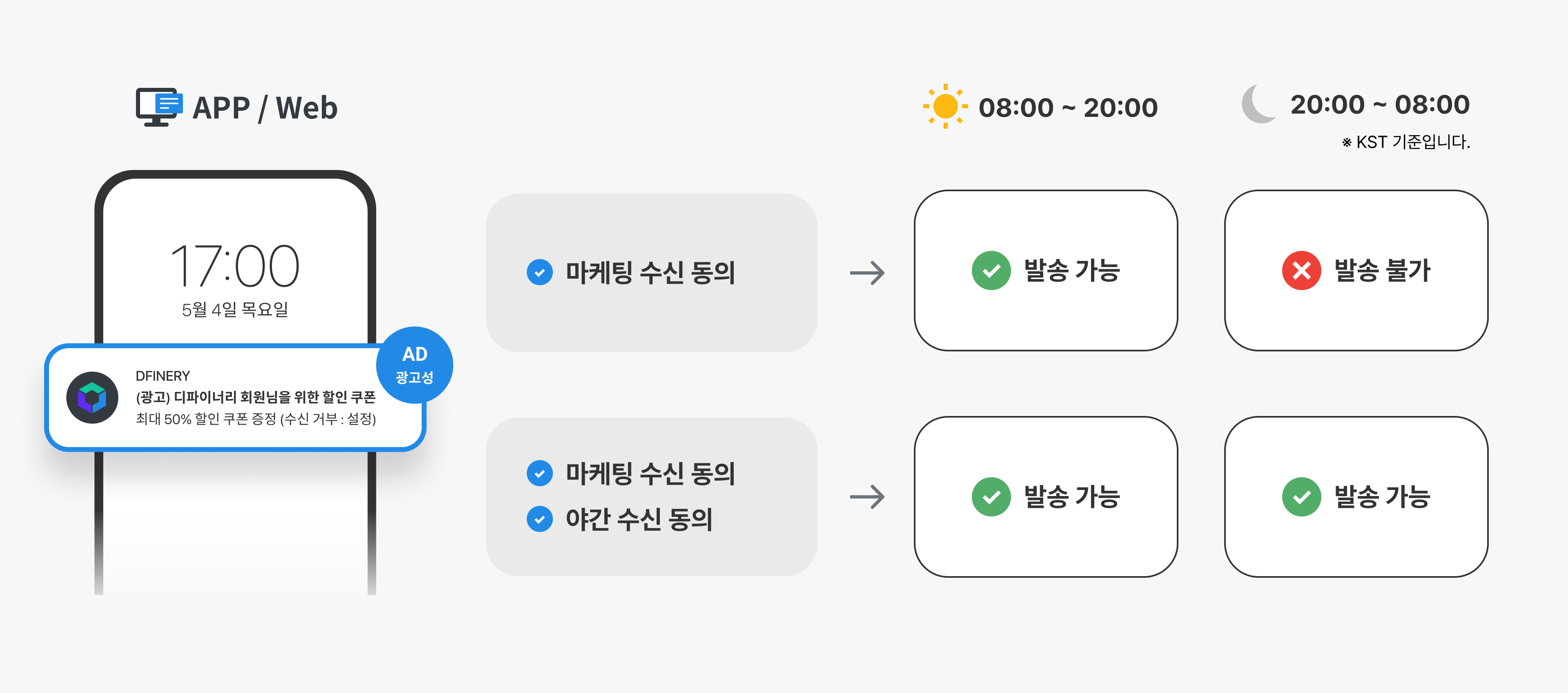 * App/Web (advertisement): 24 hours / 'advertisement' marketing consent required ('**nighttime consent**' required separately when sent at night)