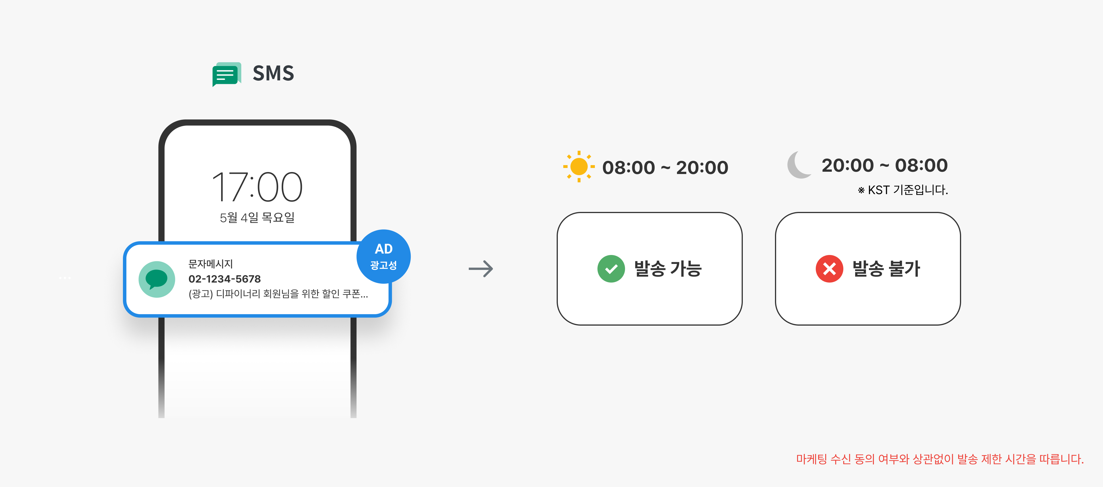 * SMS (advertising): 08:00 \~ 20:00 / Consent to receive 'advertising' marketing is required **(However, sending outside of available hours is not possible)**