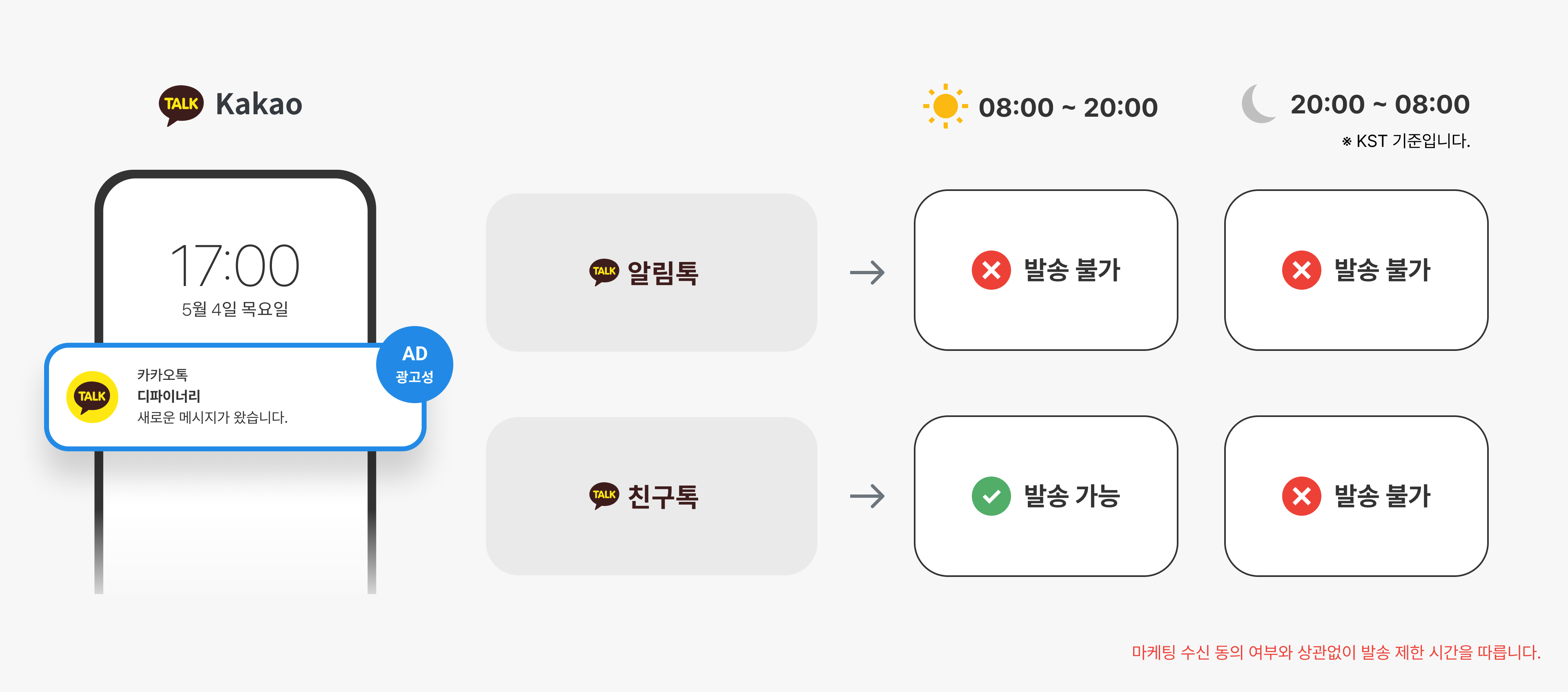 * Kakao Friends Talk (Advertisement): 08:00 \~ 20:00 / Consent to receive 'advertisement' marketing is required (**However, sending outside of available hours is not possible**)