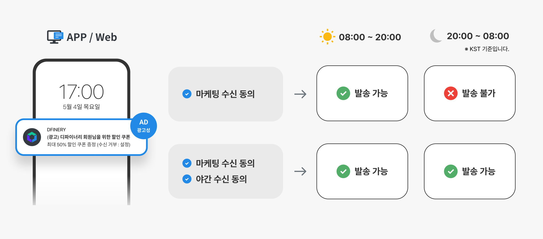 App/Web (advertisement): 24 hours / 'advertisement' marketing consent required ('nighttime consent' required separately when sent at night)