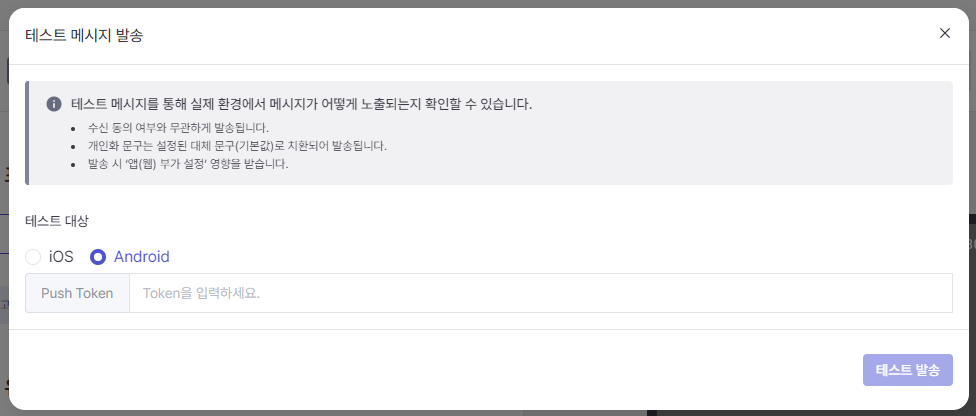 You can enter a push token and send a test message through the 'Test Send' function in the upper right to see how the message is displayed in a real environment.
