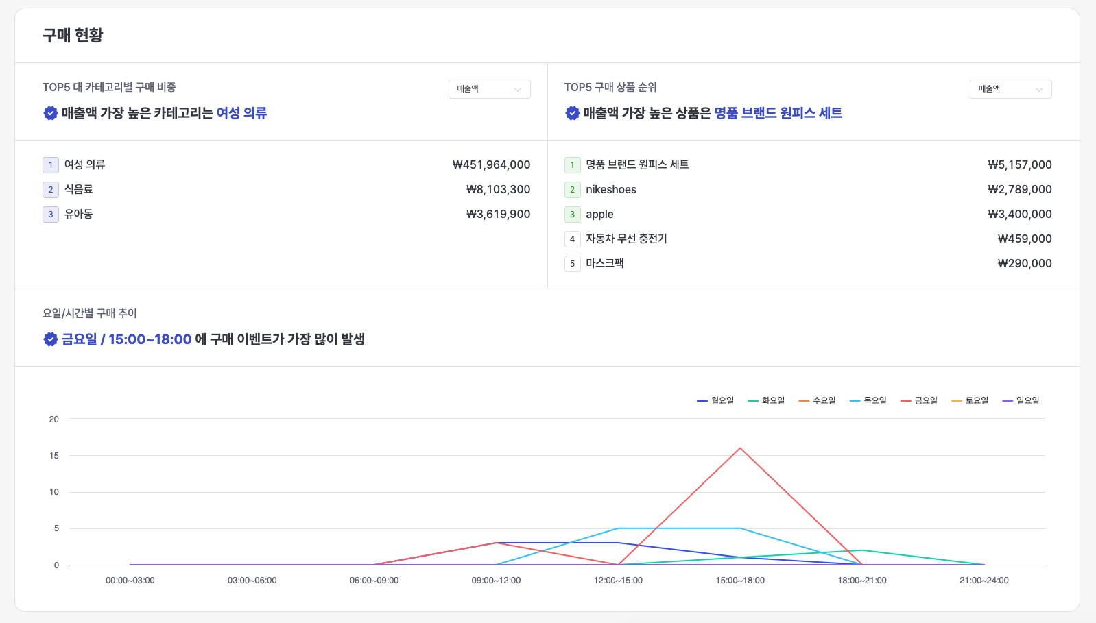 When a purchase event occurs, you can check the top 5 rankings based on the product name and category included in the product information, sales, number of sales, and sales quantity.