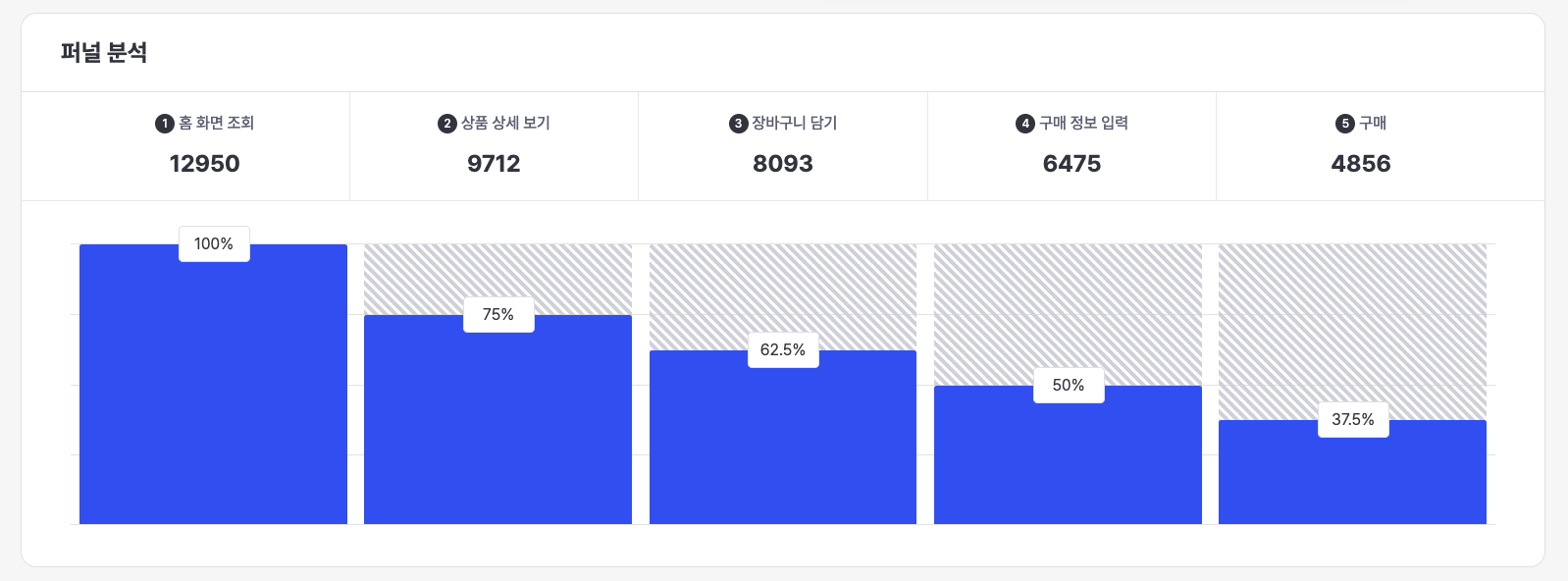 You can check the number of events that occurred according to the specified event flow. This funnel is counted only when each step is carried out sequentially. For example, if a purchase event occurs immediately after viewing the home screen, the purchase event is not counted.