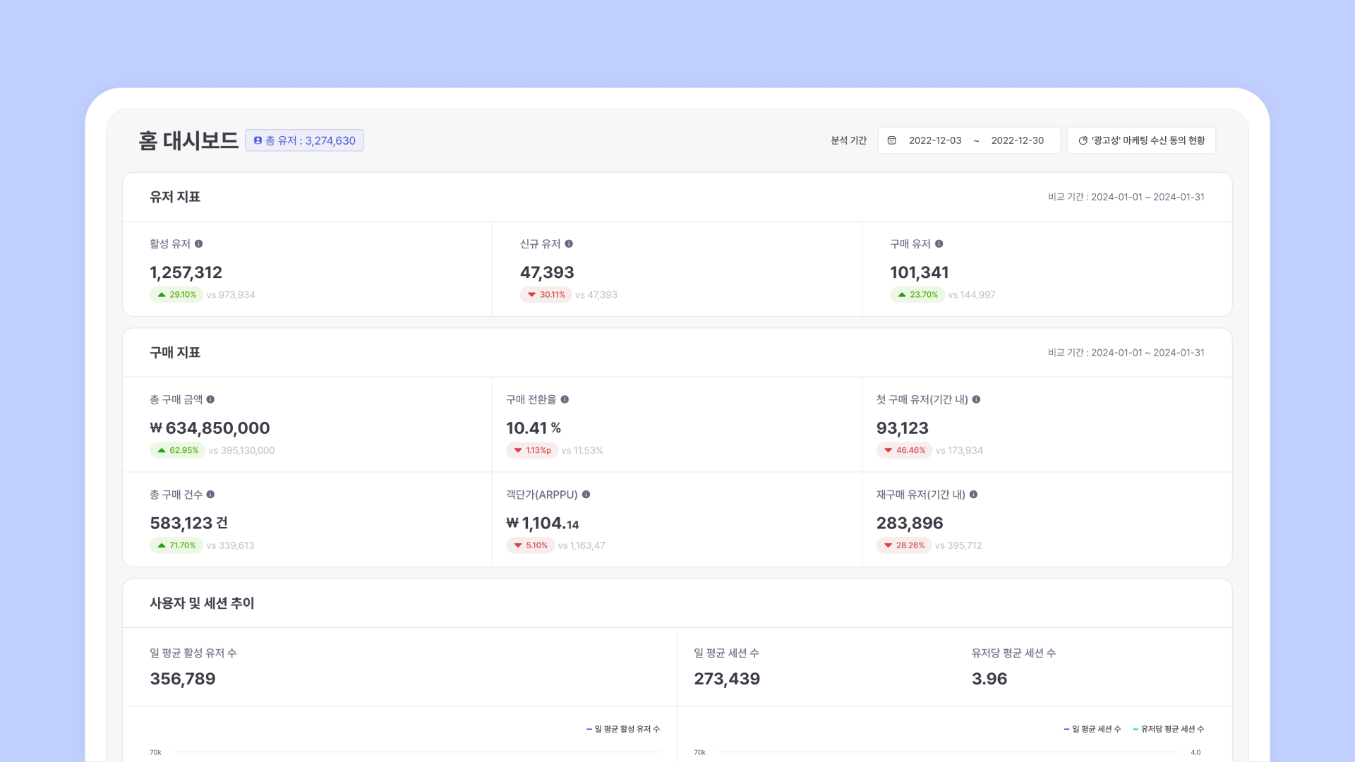 The Home Dashboard is the first screen that is designed to provide users with a quick overview of key metrics they frequently need to check. You can quickly understand key figures such as user metrics, purchase metrics, user and session trends, and if additional analysis is needed, you can create and check a separate report.
