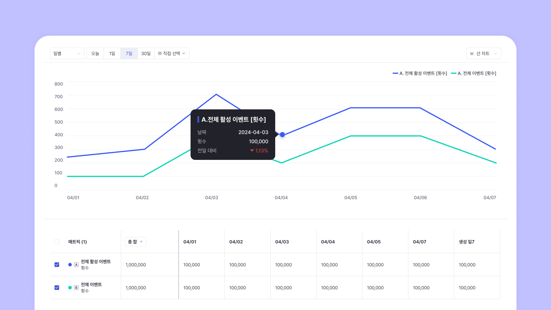 When you change the analysis period and query unit in the upper left area when creating a report, the changes are applied in real time. In DFINERY, you can check data by hour, day, week, and month, and the query period varies depending on each query unit.