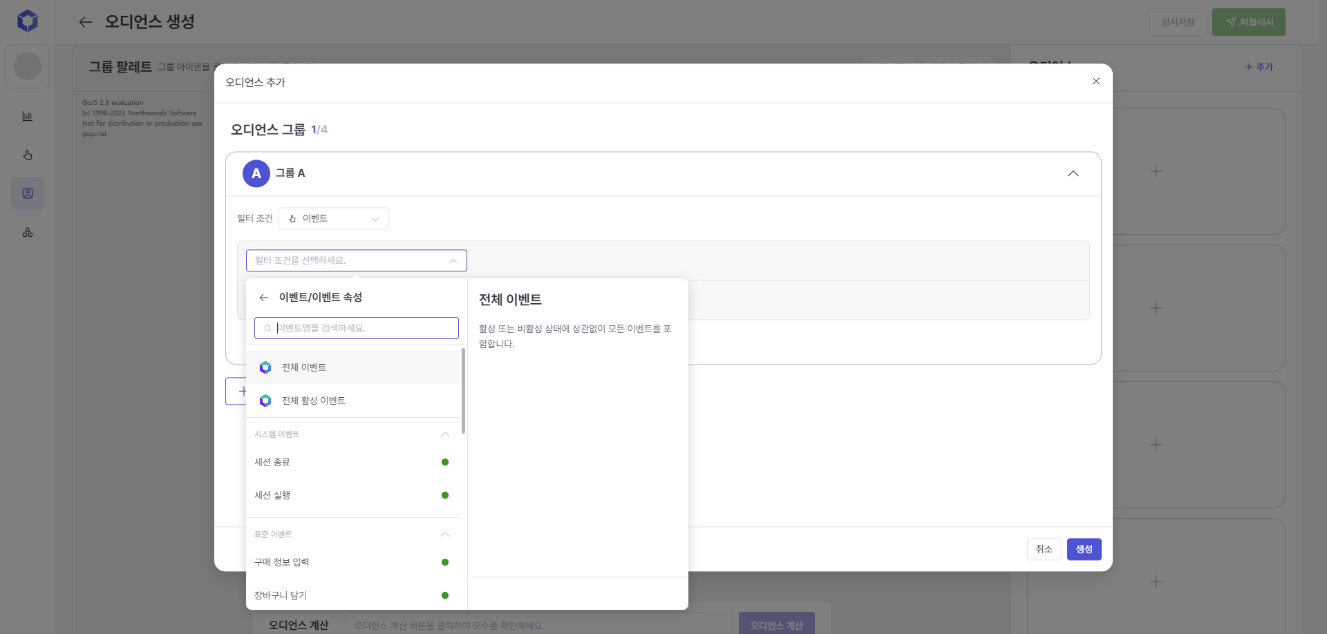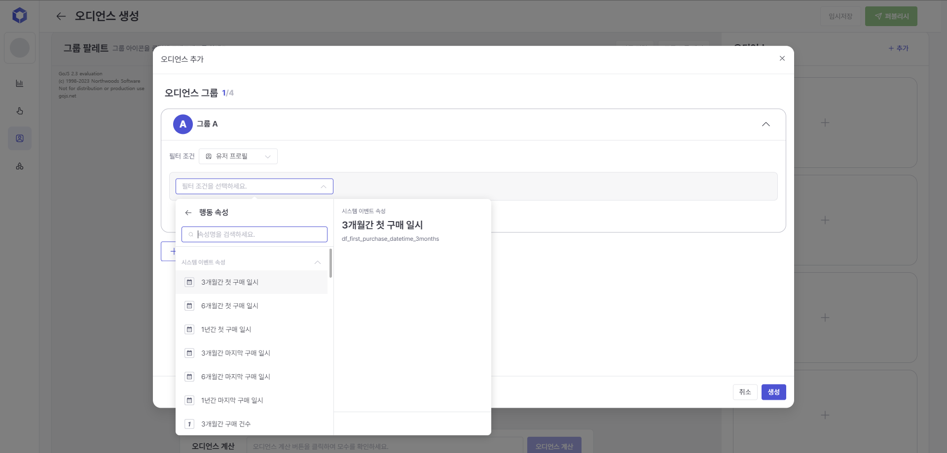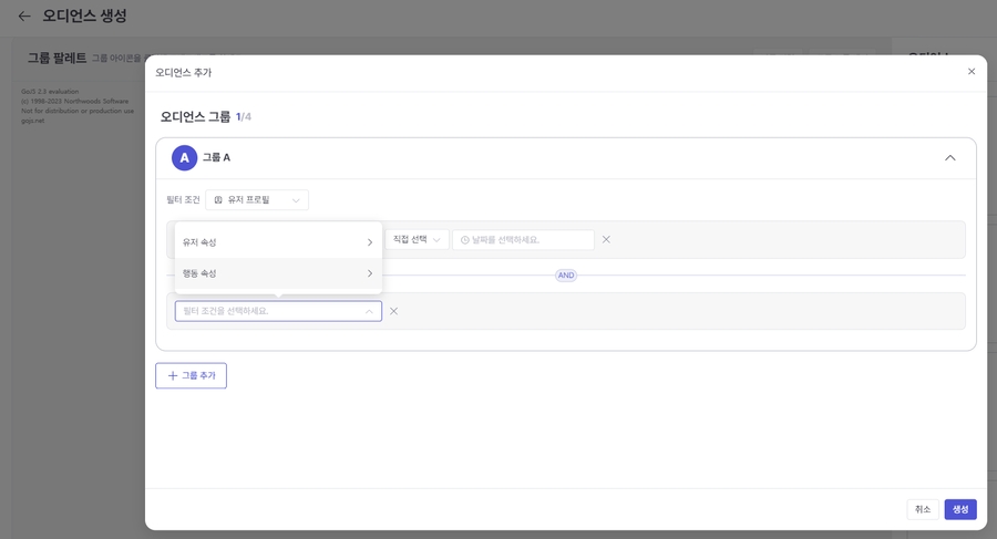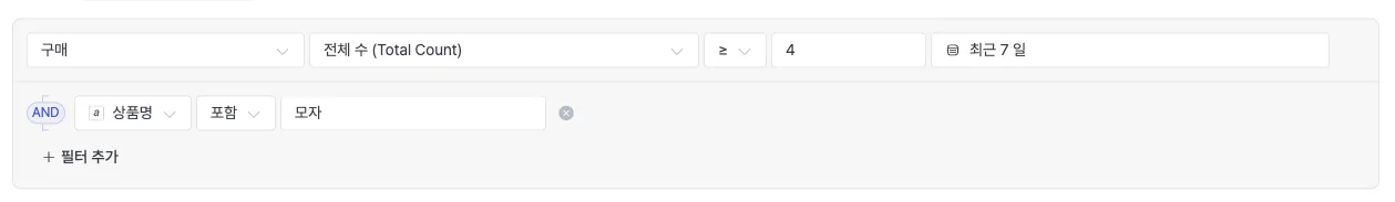 When selecting 'Event/Event Attribute', You can enter filtering conditions by selecting events such as purchases and their attribute information (product category, purchase amount, etc.).