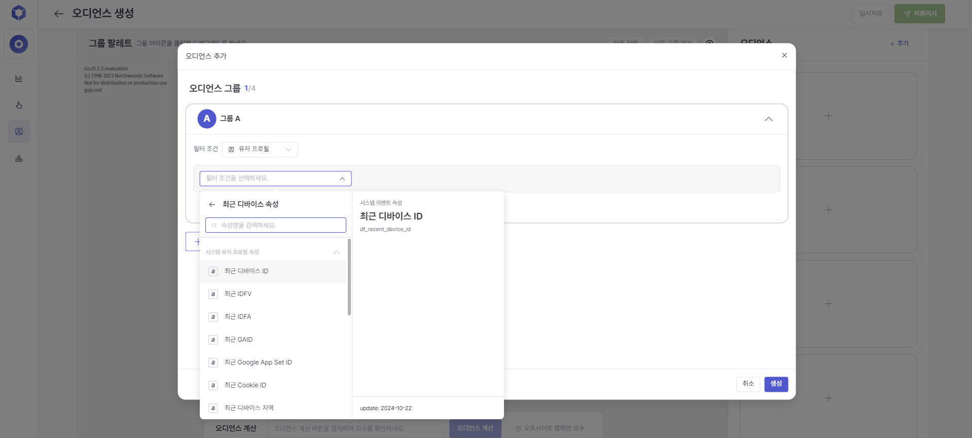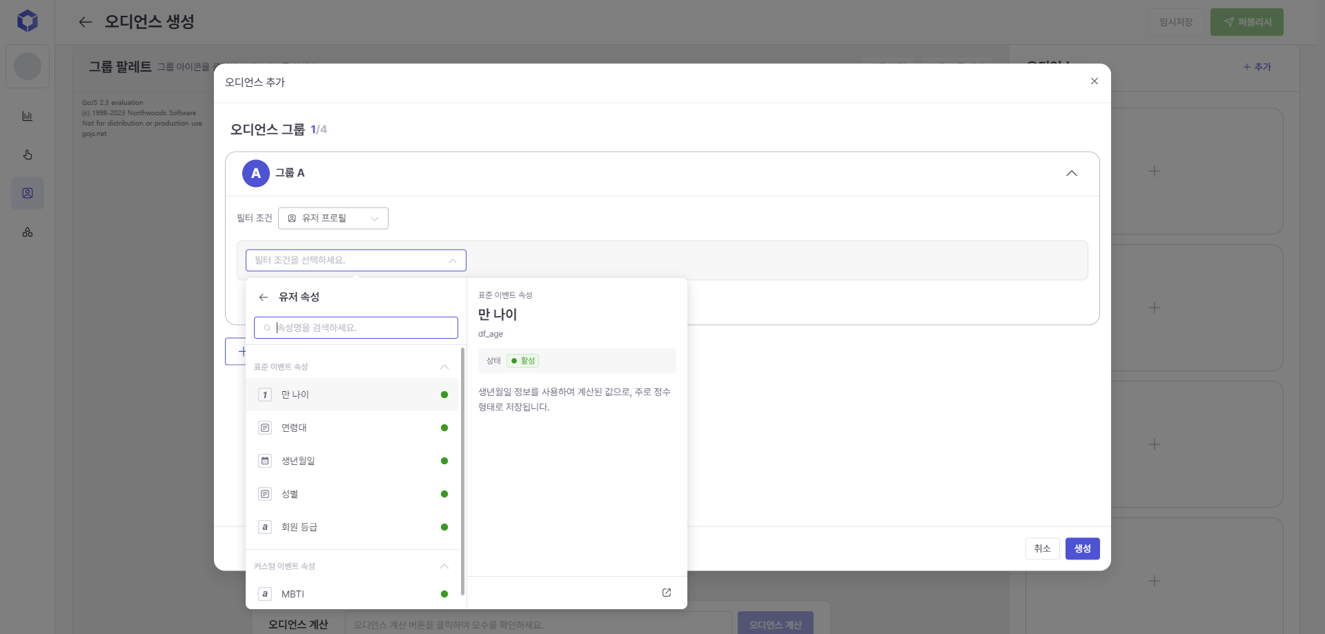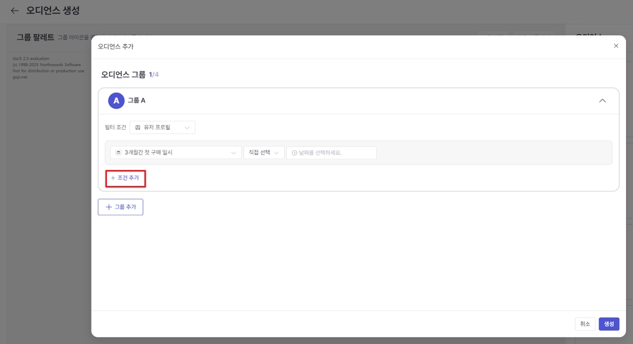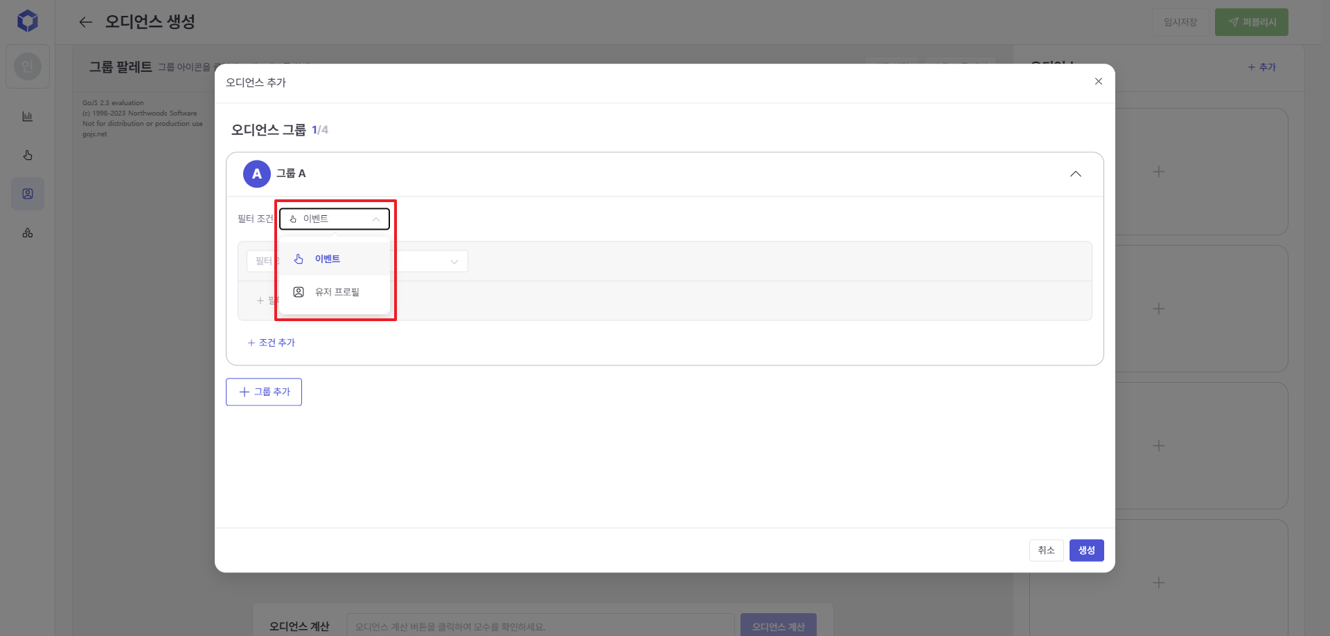 When selecting 'Event/Event Attribute', You can enter filtering conditions by selecting events such as purchases and their attribute information (product category, purchase amount, etc.).