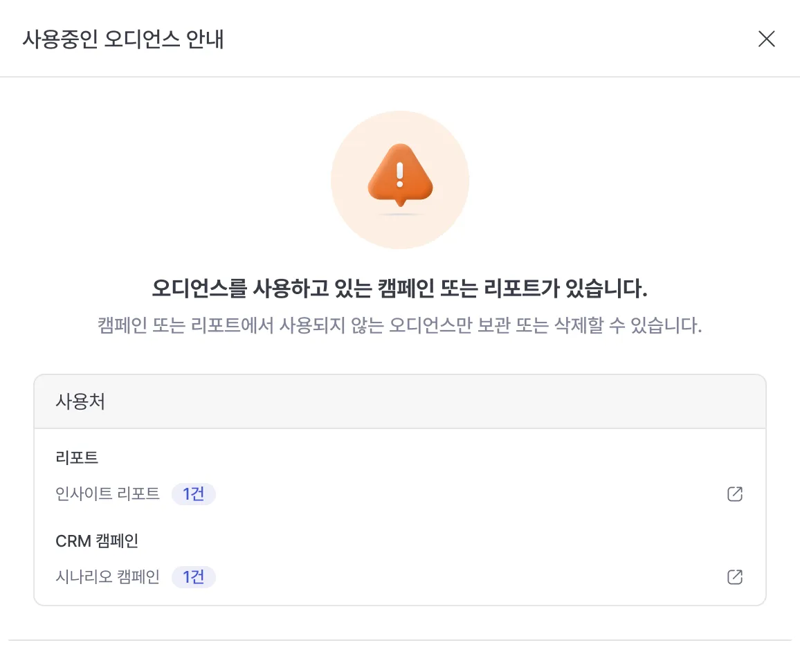 Audiences that are being used in CRM campaigns or report filters cannot be archived. When archiving or deleting an audience, if the audience is being used in analysis or campaigns, you must directly deactivate and delete the audience or change it to archive status in the campaign area.