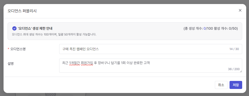 When selecting 'Behavior Attribute', You can enter filtering conditions by selecting user-specific behavior attribute information automatically calculated by cycle, such as the number of purchases or purchase amount during a specific period.