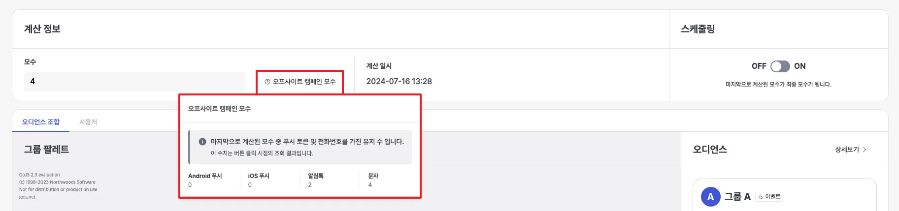 When you enter the generated audience details screen, you can check the offsite campaign parameters or set whether to schedule it.