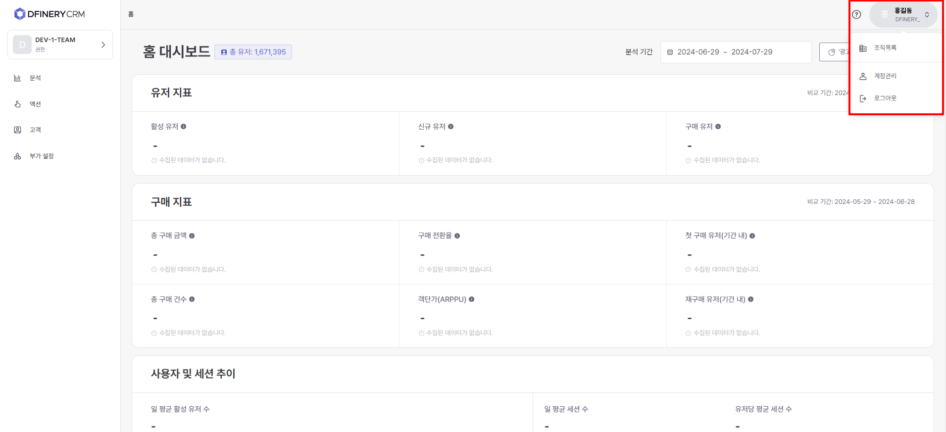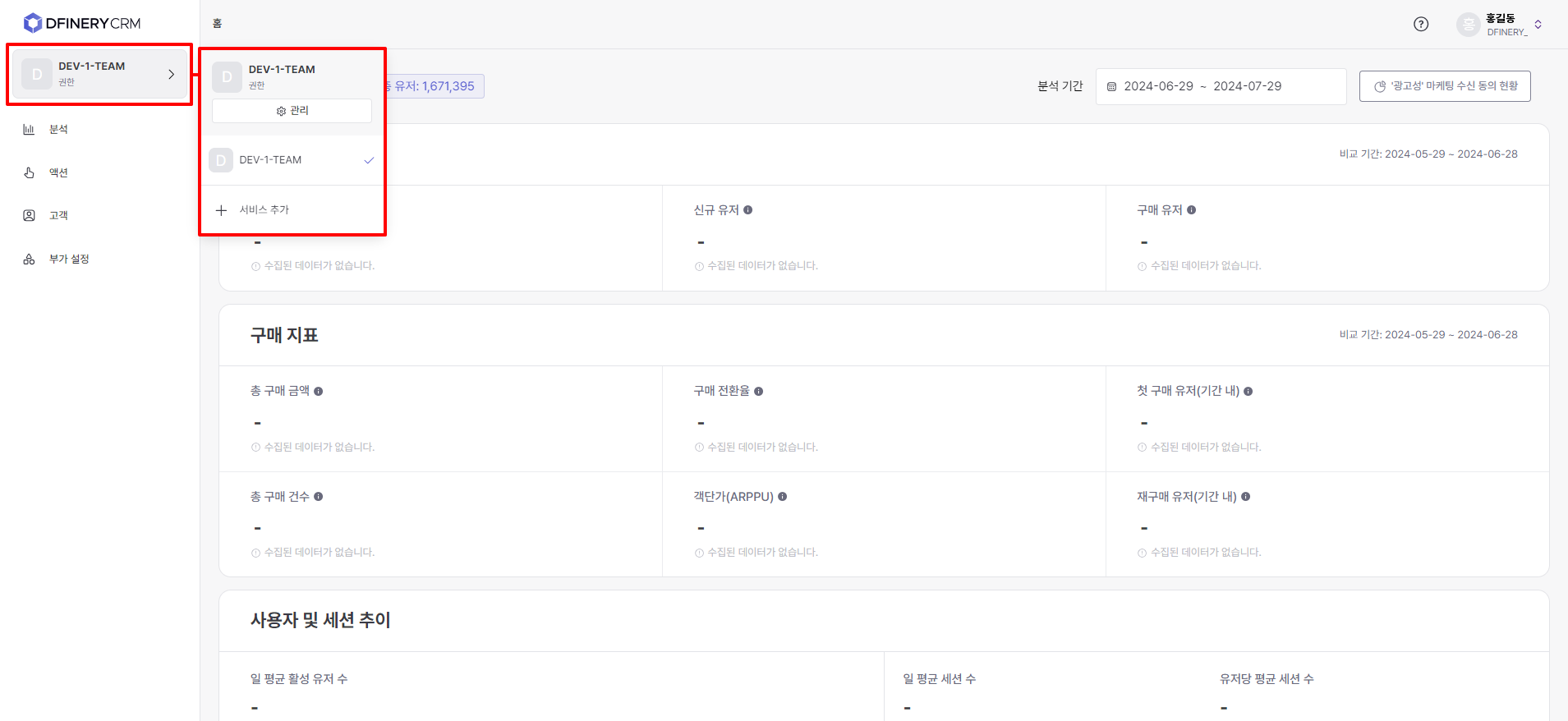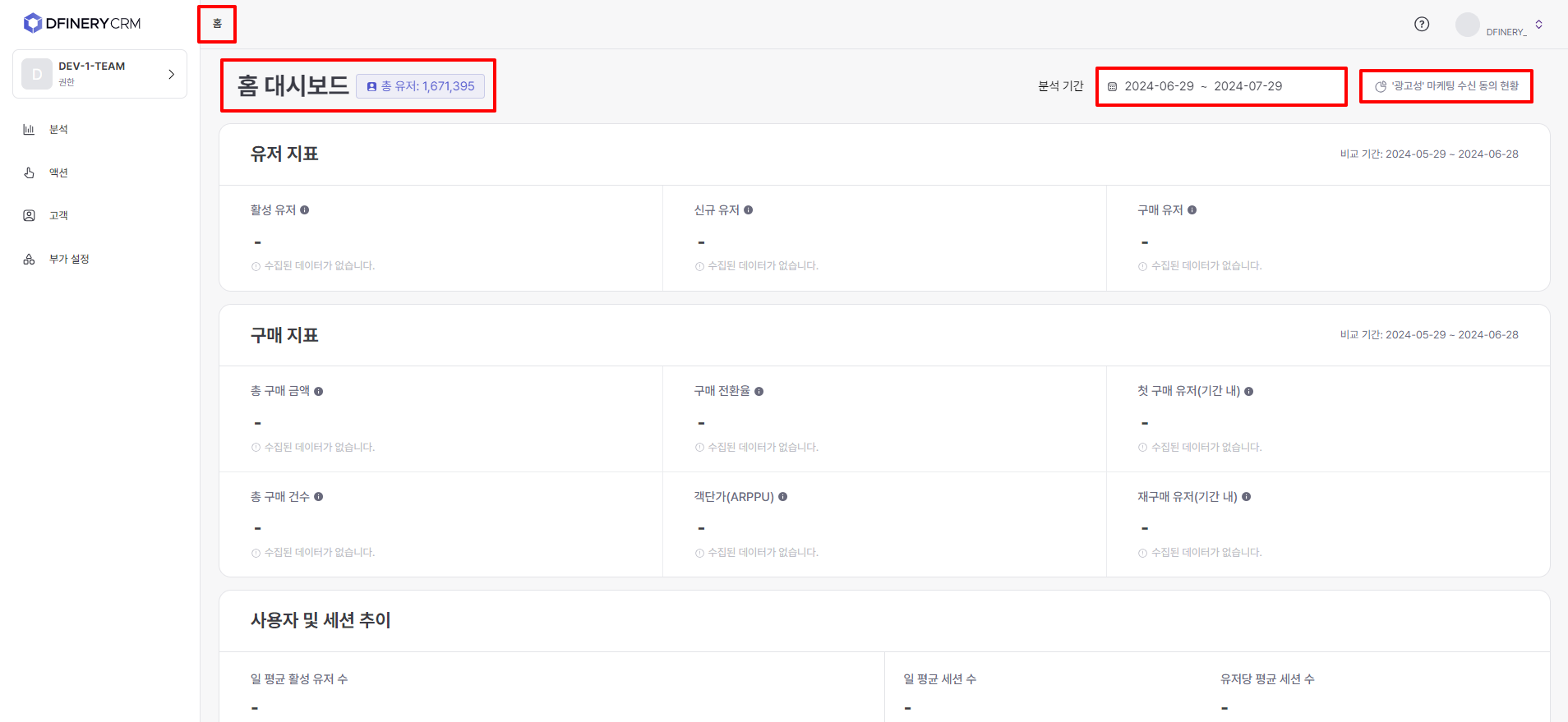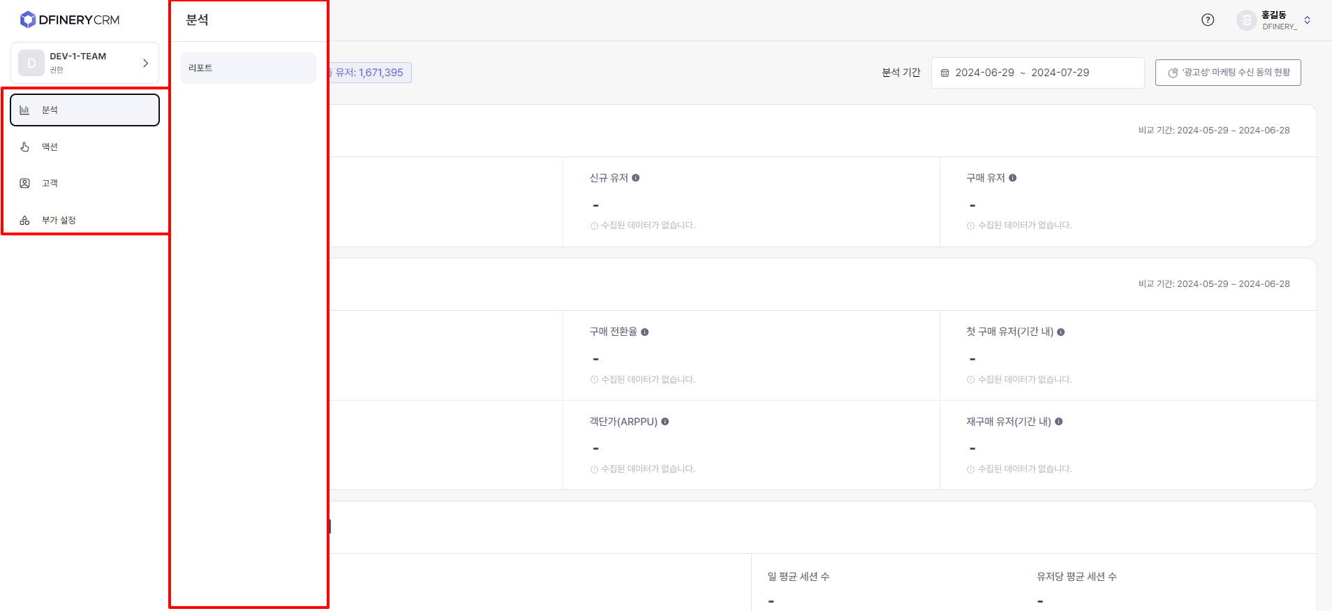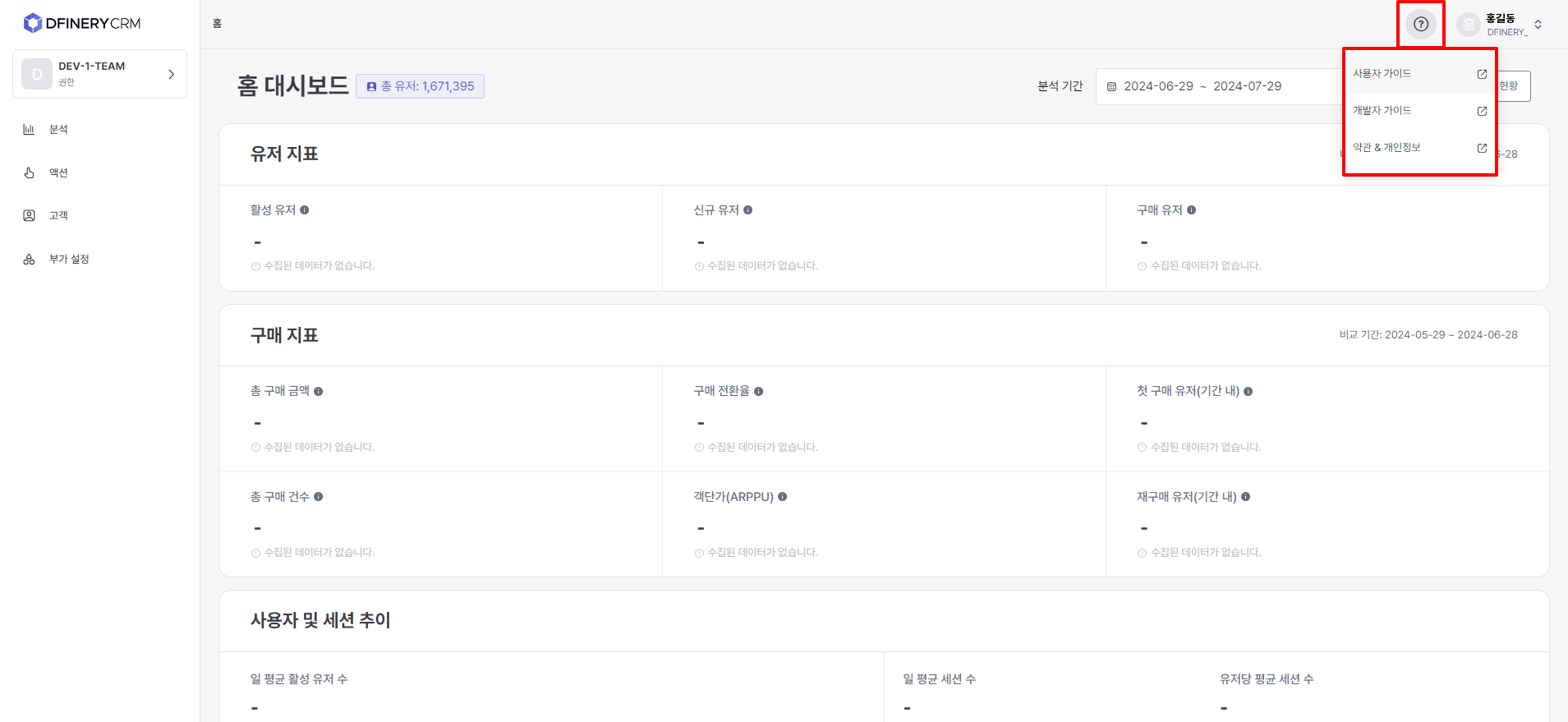 <table><thead><tr><th width="125">Menu name</th><th width="357">Explanation</th><th>Go to guide</th></tr></thead><tbody><tr><td>Analyze</td><td>The home dashboard provides a quick overview of key indicators related to the overall service status. In the report, you can set the desired conditions to check the specific indicators you want to analyze.</td><td><a href="https://docs.dfinery.ai/user-guide/en/undefined-1/home-dashboard">Home Dashboard </a><a href="https://docs.dfinery.ai/user-guide/en/undefined-1/report">Reports</a></td></tr><tr><td>Action</td><td>This menu allows you to run CRM campaigns directly towards customers through push messages, KakaoTalk, text messages, pop-ups, etc.</td><td><a href="https://docs.dfinery.ai/user-guide/en/undefined-2/off-site-campaign/push-message">Push message</a><a href="https://docs.dfinery.ai/user-guide/en/undefined-2/off-site-campaign/kakao-talk">KakaoTalk </a><a href="https://docs.dfinery.ai/user-guide/en/undefined-2/off-site-campaign/text-message">text message </a><a href="https://docs.dfinery.ai/user-guide/en/undefined-2/on-site-campaign/in-app-message/create-in-app-message">In-app message</a></td></tr><tr><td>Customer</td><td>This menu supports the ability to create audiences to be used for campaigns or analysis, and the ability to check information about individual customers.</td><td><a href="https://docs.dfinery.ai/user-guide/en/undefined-3/user-profile-360">User Profile 360 </a><a href="https://docs.dfinery.ai/user-guide/en/undefined-3/audience">​​Audience</a></td></tr><tr><td>Additional settings</td><td>This menu supports presets required to utilize various functions within the Action menu.</td><td><a href="https://docs.dfinery.ai/user-guide/en/undefined-2/off-site-campaign/push-message/setting">Setting up </a><a href="https://docs.dfinery.ai/user-guide/en/undefined/event-and-property">event and attribute linkage push </a><a href="https://docs.dfinery.ai/user-guide/en/undefined-2/off-site-campaign/kakao-talk/setting-profile">Setting up KakaoTalk sender profile </a><a href="https://docs.dfinery.ai/user-guide/en/undefined-2/off-site-campaign/kakao-talk/alim-talk/template">Creating KakaoTalk template </a><a href="https://docs.dfinery.ai/user-guide/en/undefined-2/off-site-campaign/text-message/setting-profile">Setting up text</a></td></tr></tbody></table>