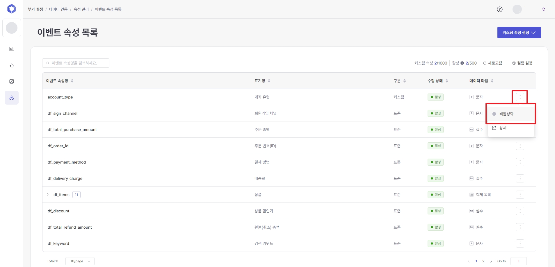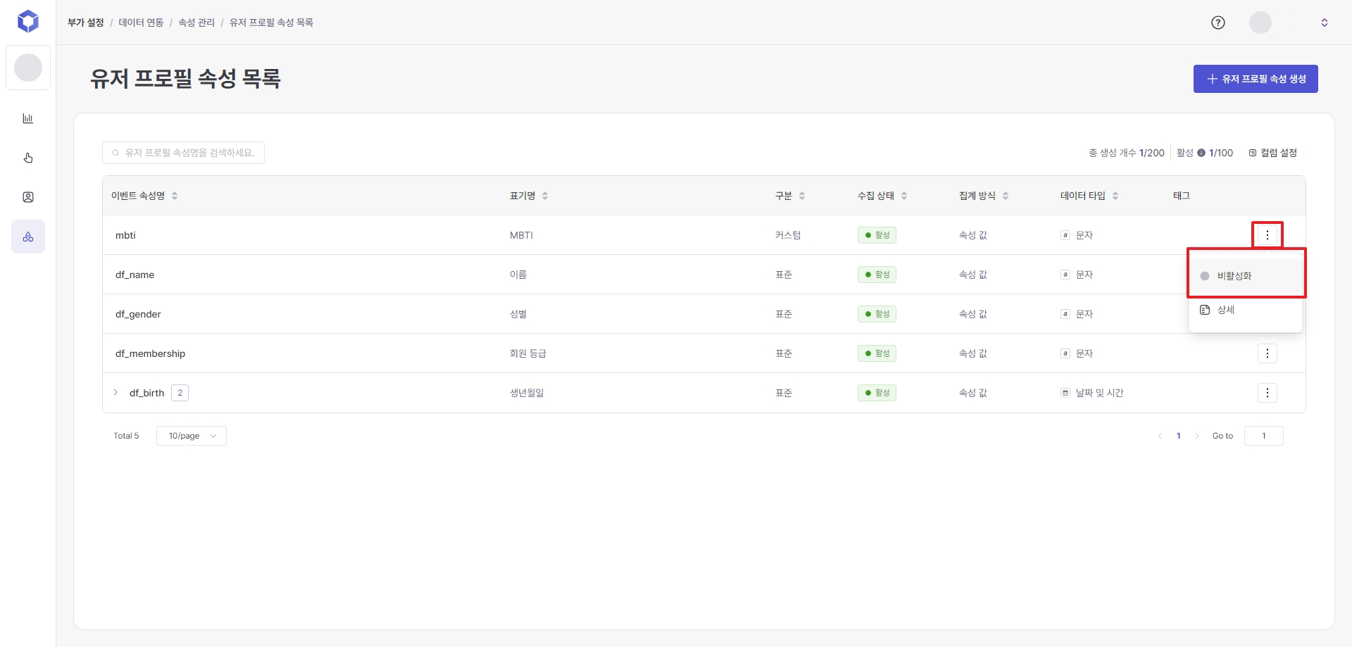 Home > Additional Settings > Data Linking > Attribute Management > User Profile Attribute List > ⋮ (Settings) button on the right side of each event attribute list